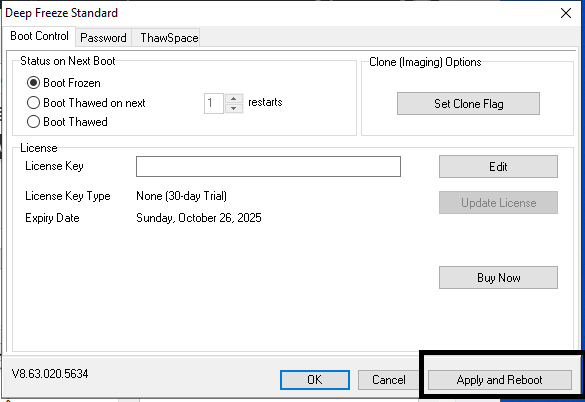 Bước 4: Sau khi chọn xong các chế độ bạn mong muốn nhấn chọn Apply and Reboot. Máy tính sẽ khởi động lại để kích hoạt Deep Freeze