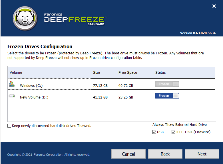 Bước 6: Trong cửa sổ Frozen Drives Configuration sẽ hiển thị những ổ cứng trong máy tính. Bạn tích chọn vào ổ cứng mà mình muốn đóng băng. Tiếp theo chọn Next.