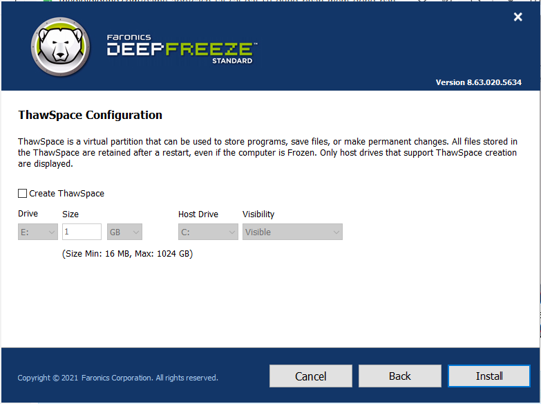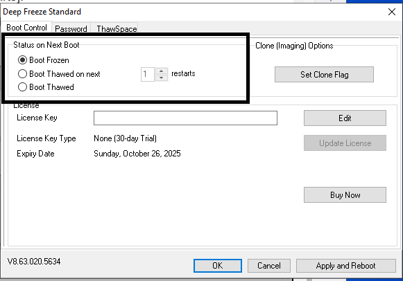 - Boot Thawed: Tắt chế độ đóng băng, nghĩa là lúc này bạn có thể cài đặt, ghi chép hoặc xóa dữ liệu bình thường trên ổ cứng.